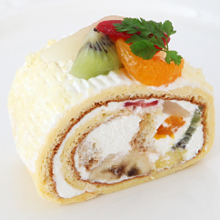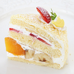 4層になったスポンジの間には黄桃と生クリームがサンドされ、上には季節のフルーツをのせました。